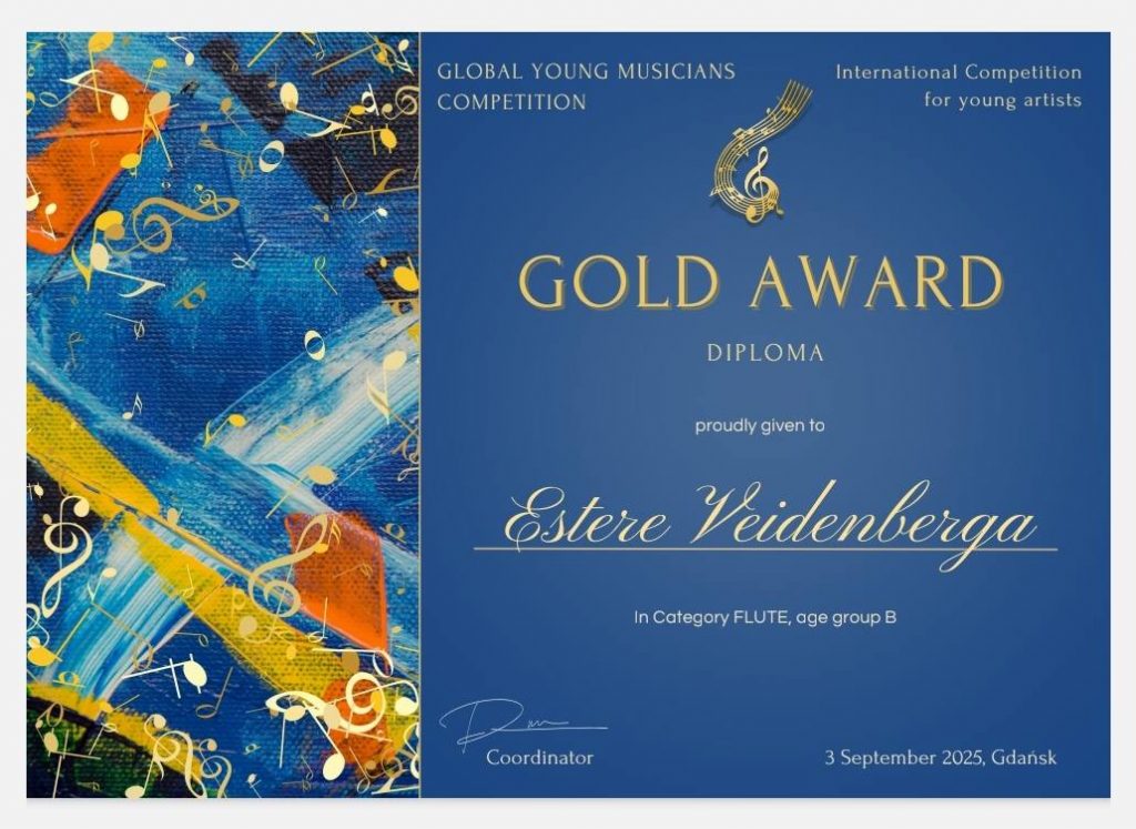 Starptautiskā jauno mūziķu konkursā Gdaņskā (Polija), kurā piedalījās jaunie mūziķi no visas pasaules, žūrija ne tikai izvirzīja uz fināla kārtu mūsu Esteri Veidenbergu… finālā Estere ieguva ZELTA BALVU!